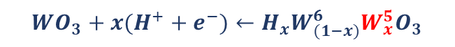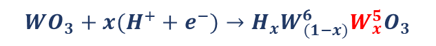 Gate에 + 전압의 pulse를 가하면 Electrolyte에 있던 cation들이 WOx로 이동하게 됩니다. 그러면 Electrolyte와 WOx 사이에서 다음과 같은 반응이 일어납니다.