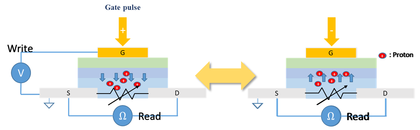 EC-transistor는 소자에 pulse를 가해서 작동시킵니다. 편의상 RRAM과 마찬가지로 저항이 낮아지는 과정을 potentiation, 저항이 높아지는 과정을 depression이라고 naming 하겠습니다.