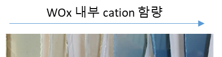 여기서는 cation의 예시로 H+를 넣었는데요, 논문을 찾아보면 Li+를 사용하는 경우를 많이 봤습니다. 쨋든, cation이 WOx에 삽입되면 W이 +6에서 +5로 변하게 됩니다. 이 W5로 인해서 WOx의 optical, electrical 특성이 변합니다. 투명했던 박막이 불투명하게, 그리고 고저항이 저저항으로 변합니다.