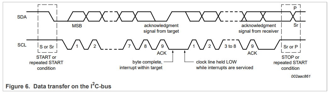 ACK(Acknowledge)와 NACK(Not Acknowledge)는 모든 byte에 따라옵니다. ACK는 Slave가 byte를 잘 받았으며, 다음 transfer를 진행해도 된다는 것을 의미하고(Low), NACK는 Slave가 데이터를 잘 받지 못했다는 것을 의미합니다(High). Master는 Slave가 NACK 신호를 보내면 transfer를 중단하기 위해 STOP condition을 보내거나, 새로운 transfer를 시작하기 위해 START condition을 보냅니다.