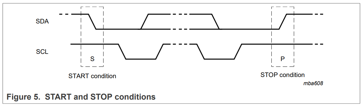 I2C 통신의 시작과 끝은 컨트롤러에 의해 제어됩니다. 통신이 시작되면 data 주고받는 signal인 SDA가 먼저 High에서 Low로 변합니다. 그 후에 I2C clock인 SCL도 Low로 변경되고 이러면 Master, Slave 모두 I2C 통신이 시작됐다는 것을 인식하고 버스는 busy 상태로 인식하게 됩니다.